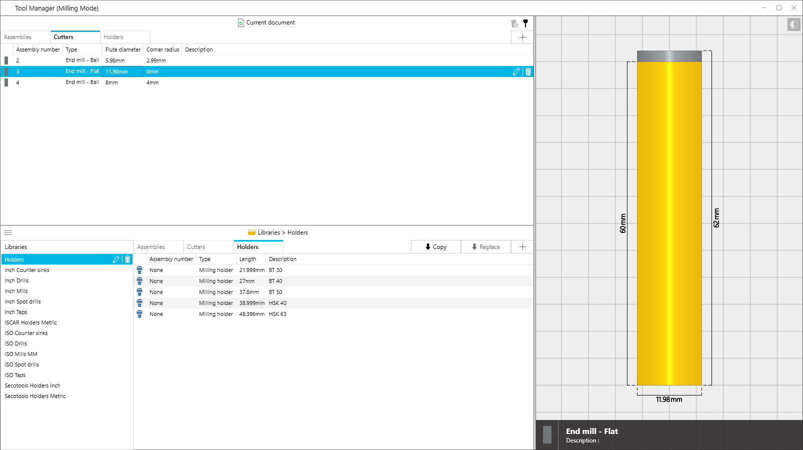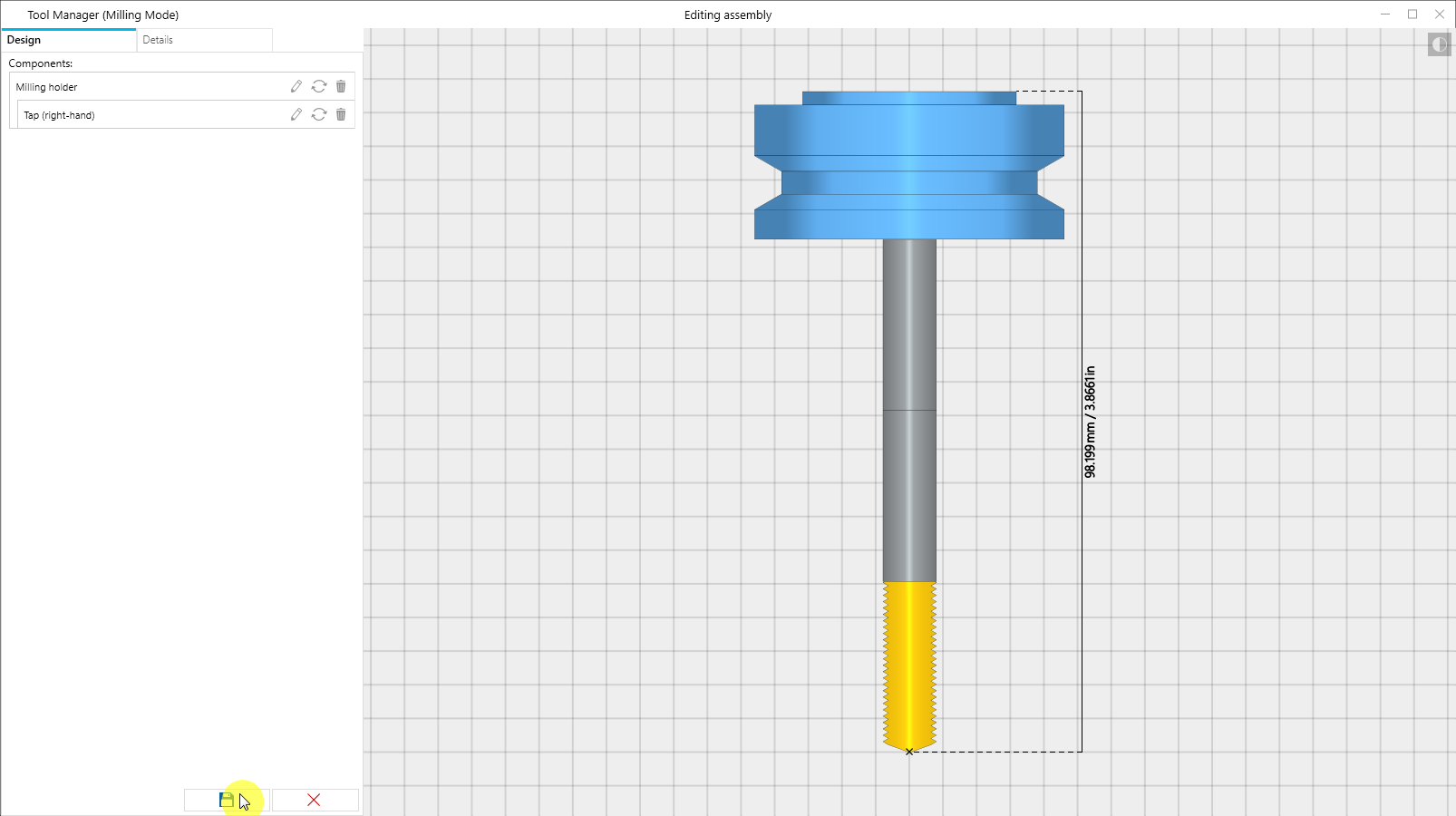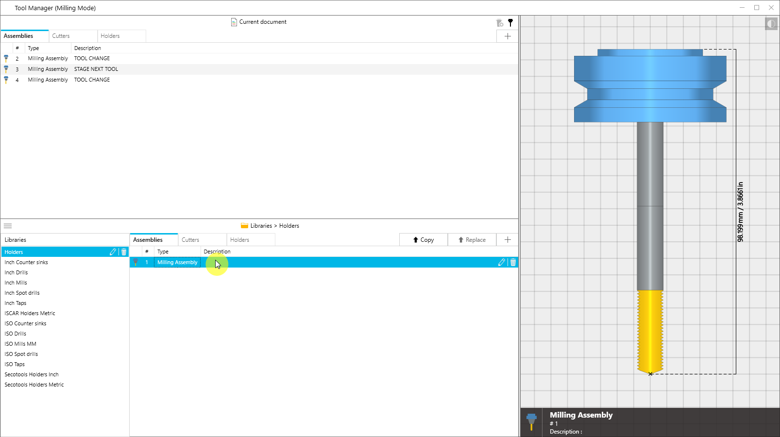 - Assemblies are the complete package. A cutter paired with a holder. This is what shows up in your simulation and what gets checked for collisions.