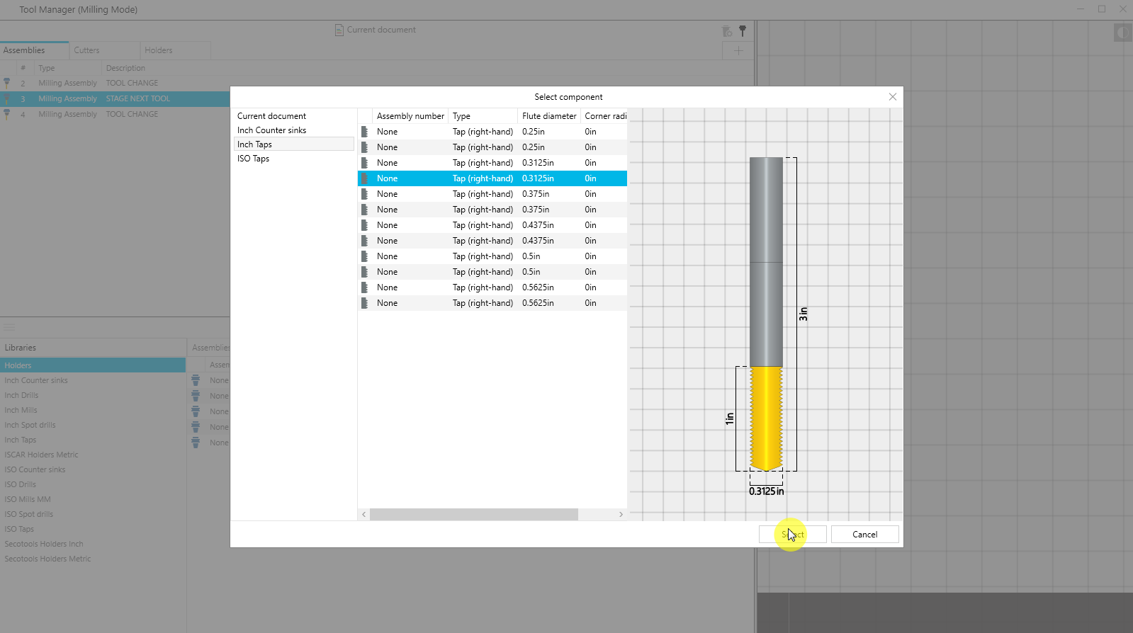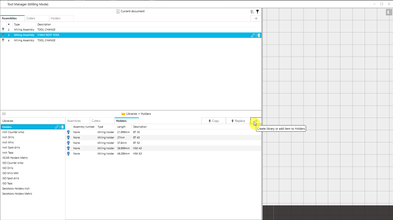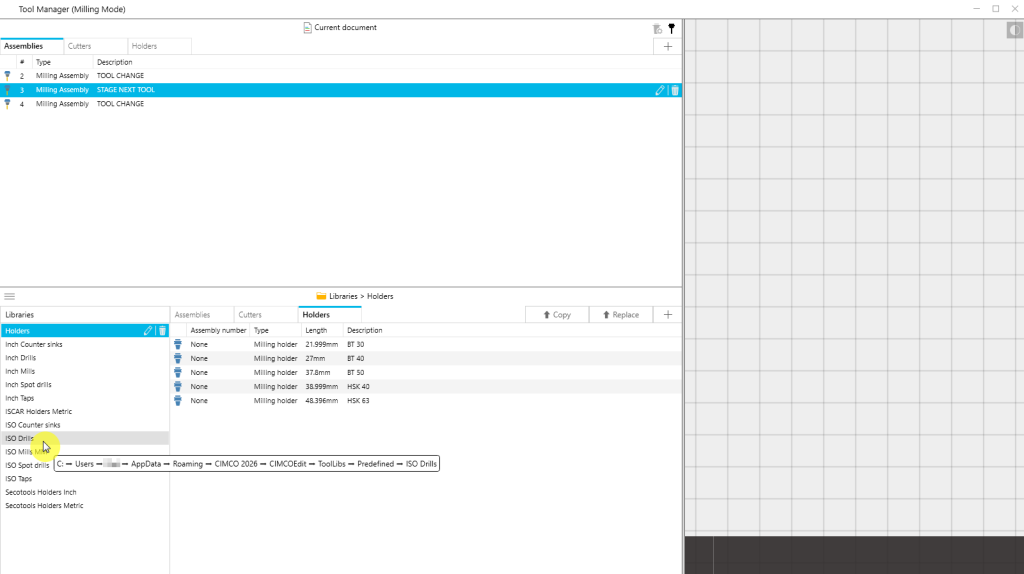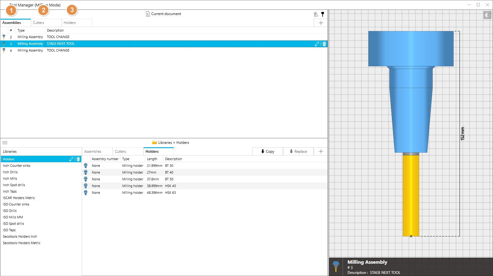 - Assemblies are the complete package. A cutter paired with a holder. This is what shows up in your simulation and what gets checked for collisions.