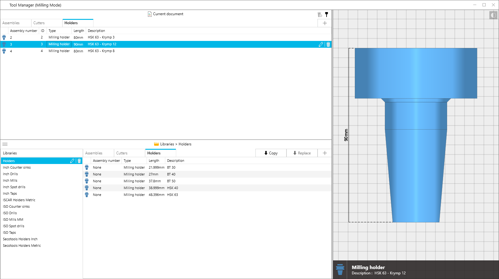 - Holders work the same way. Milling holders are built from a stack of segments, each defined by an upper width, lower width, and length. Turning holders have their own type-specific parameters. Either way, the preview updates live as you make adjustments.
