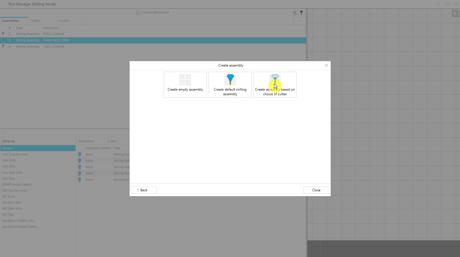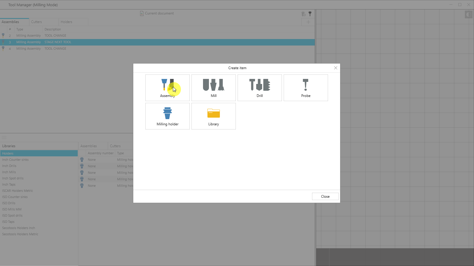 You can build new tools from scratch right inside the Tool Manager. The Create Item dialog walks you through picking what you want – assembly, cutter, holder, or a specific type like a milling tool, drill, or turning insert – and then shows you just the fields that are relevant to that item. No digging through options that don’t apply.