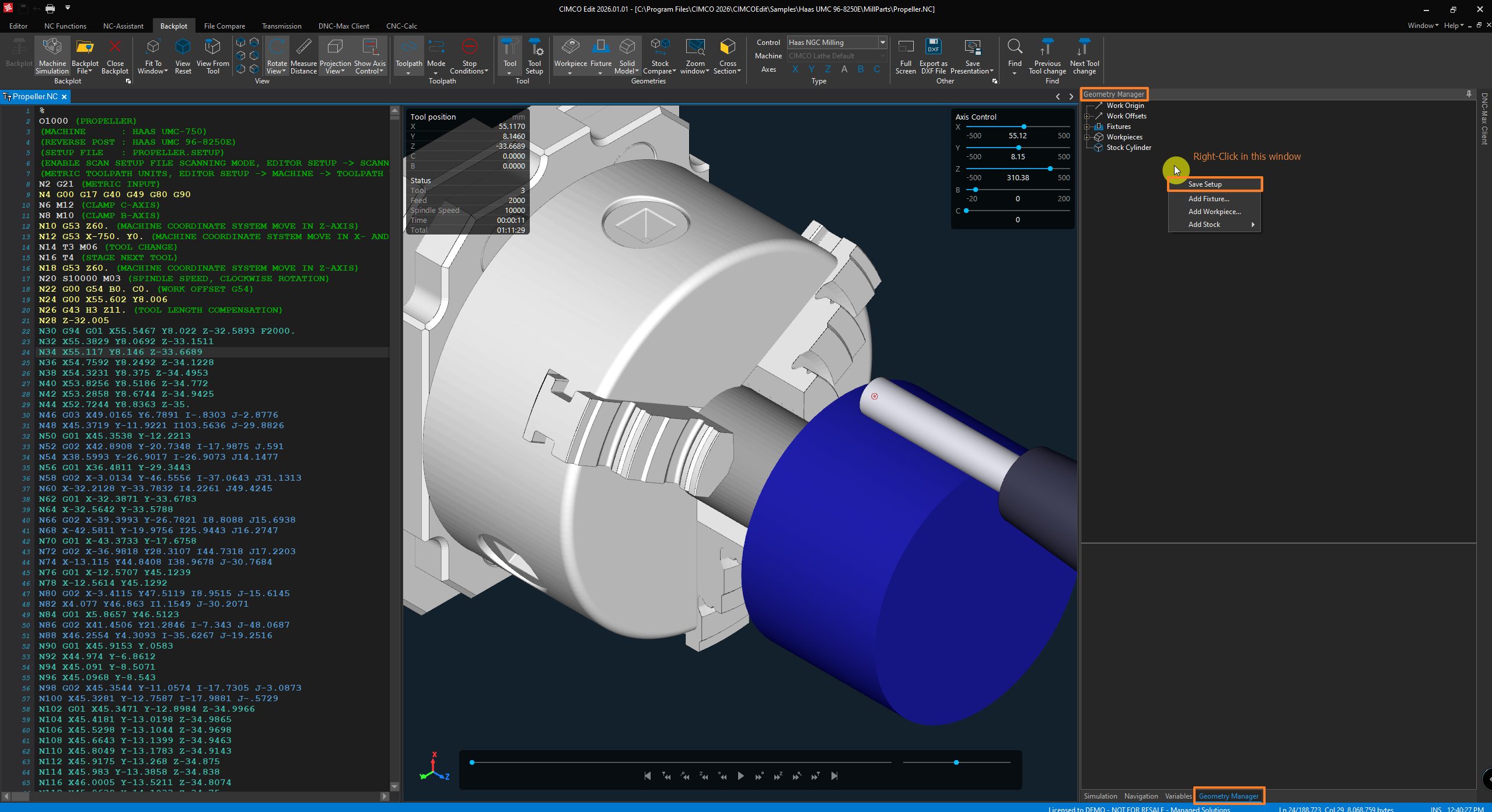 To actually save your tool configuration, close the Tool Manager, then right-click anywhere in the Geometry Manager and hit Save Setup. By default it writes to a .setup file in the same folder as your NC program. You can also have it write the configuration directly into the NC program file itself. This is controlled by the Scanning settings in your Editor Setup.